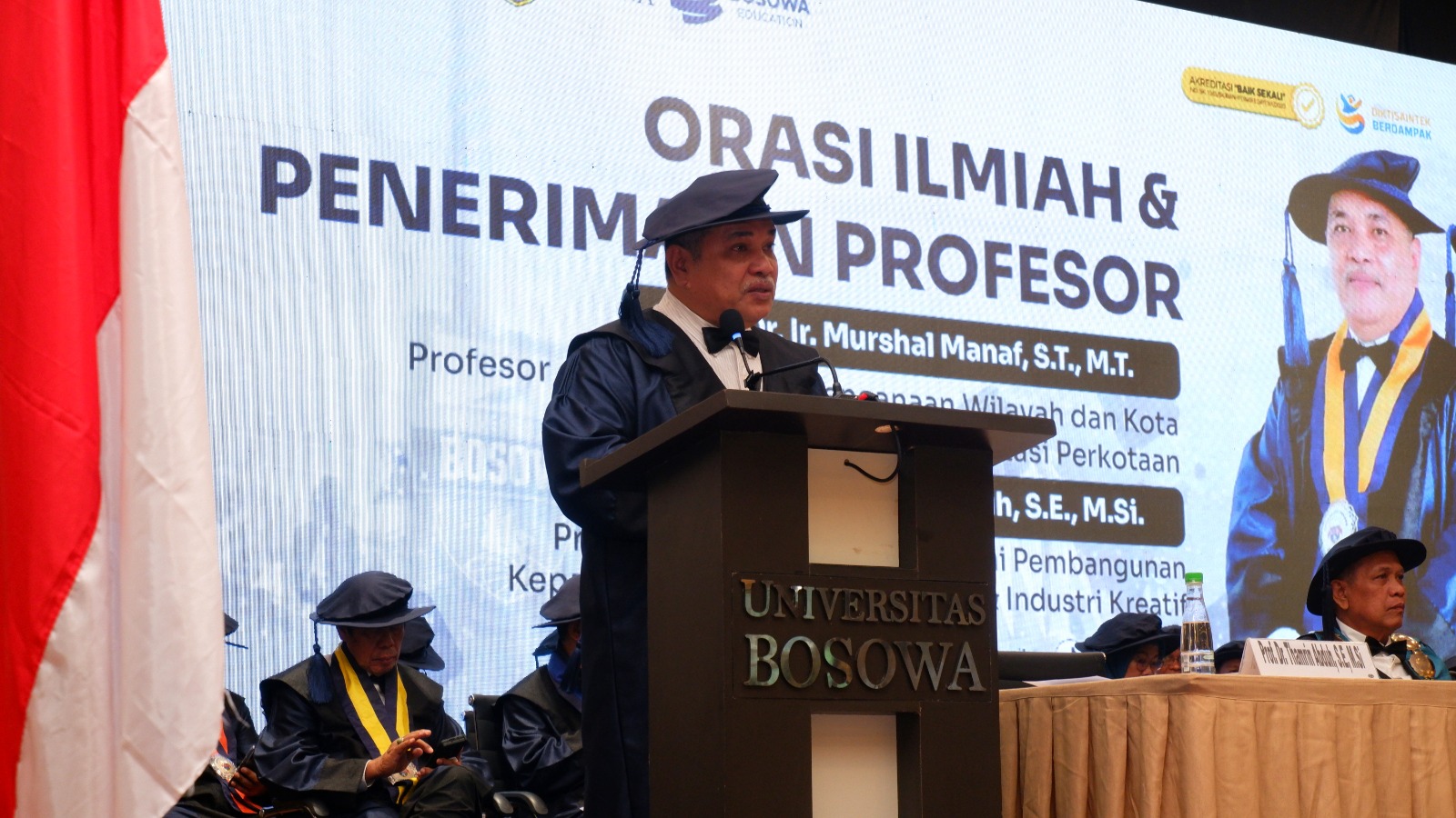 Momentum bersejarah kembali tercipta di lingkungan akademik Universitas Bosowa (Unibos) dengan dikukuhkannya Prof. Dr. Ir. Murshal Manaf, S.T., M.T. sebagai Guru Besar dalam bidang Perencanaan Wilayah dan Kota yang berfokus pada kepakaran moda transportasi perkotaan. Prosesi orasi ilmiah dan penerimaan jabatan profesor tersebut berlangsung khidmat pada Rabu, 8 Oktober 2025, di Balai Sidang Unibos, disaksikan oleh Ketua Senat Prof. Dr. Ir. Batara Surya, ST., M.Si., Ketua LLDIKTI IX Dr. Andi Lukman, M.Si., Ketua Dewan Profesor Prof. Dr. Ir. A. Muhibuddin, M.P., Ketua BPH Yayasan Aksa Mahmud Asrul Hidayat, serta jajaran profesor, dekan, dosen, dan keluarga besar Unibos.