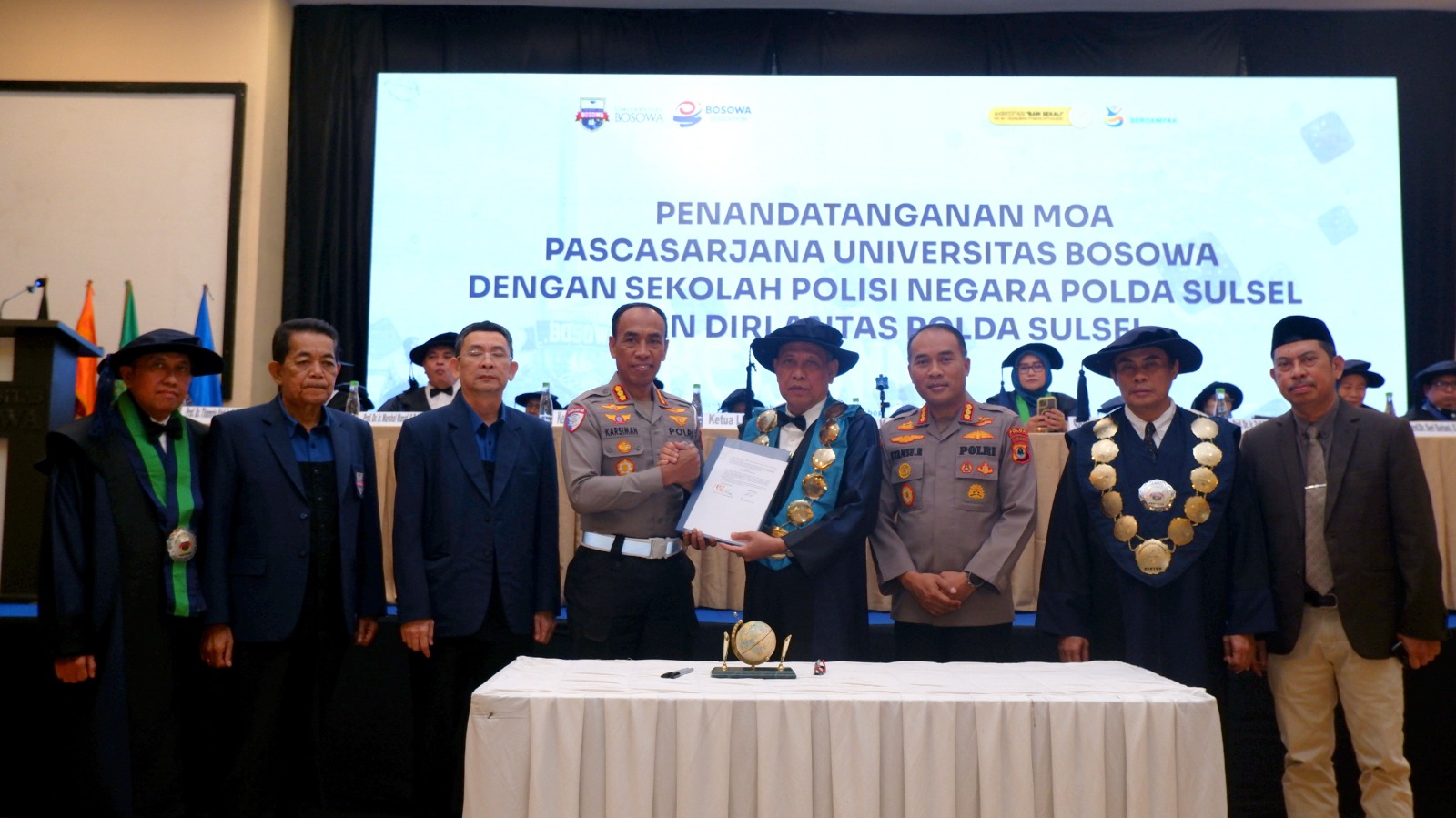 MoA tersebut ditandatangani oleh Prof. Dr. Ir. A. Muhibuddin, M.P. selaku perwakilan Unibos bersama Kombes Pol Karsiman, S.I.K., M.H., dan Syamsu Ridwan, S.I.K., serta disaksikan langsung oleh Rektor Unibos Prof. Dr. Ir. Mursyid Thamrin, M.S. dan Ketua BPH Yayasan Aksa Mahmud Asrul Hidayat. Kerja sama ini diharapkan dapat membuka peluang kolaborasi dalam bidang penelitian, pendidikan, dan pengembangan kompetensi sumber daya manusia di lingkungan kepolisian dan akademisi.
